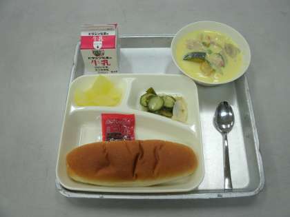 今日の給食は、かぼちゃのクリームシチュー、ミックス海そうのサラダ、りんご(カット缶)、コッペパン、いちごジャム、牛乳です。