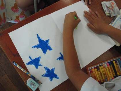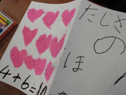 足し算をしっかりと身につけるために、足し算絵本を作りました。合わせて10になるように星や模様を描きました。今の学習内容は、繰り上がりや繰り下がりのある足し算、引き算につながっていきます。がんばって身につけてほしいと思います。