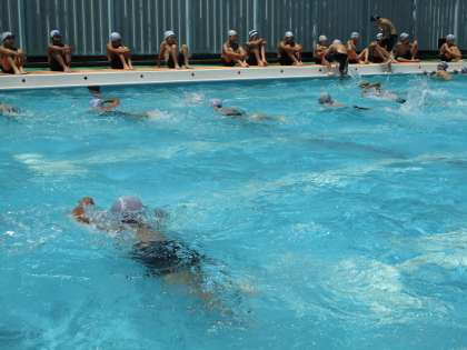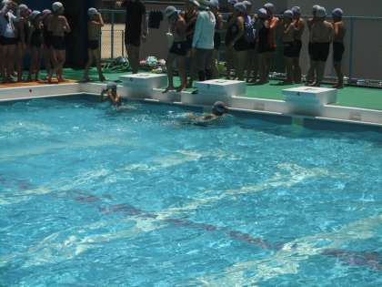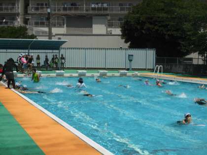 水泳で、泳力別に練習しています。100m泳ぐ児童もいれば、バタ足を強化している児童もいました。それぞれの児童が自分の課題を克服するためにしっかりと取り組んでいました。さすが高学年です。