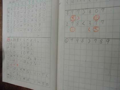 算数で、数の大きさについて学習しています。不等号(>・<)を使って大きさの関係を表しました。