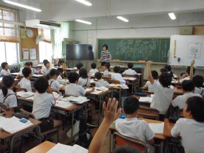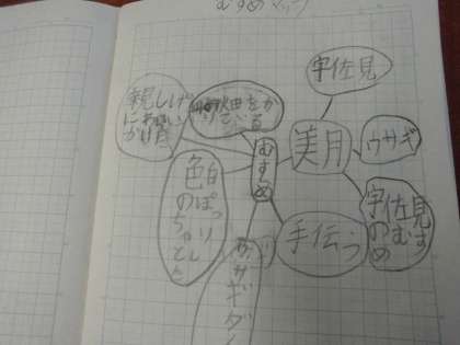 国語で物語文「夕すげ村の小さな旅館」を学習しています。話が長く登場人物も複数出てくるので、関係性をつかむのがなかなか大変です。そこで、ノートに「美月さん」と「私」をスタートとして関係ある事柄をノートに書きだしました。そのあと友達とノートを見せ合いながら交流しました。活発に話し合いができていました。