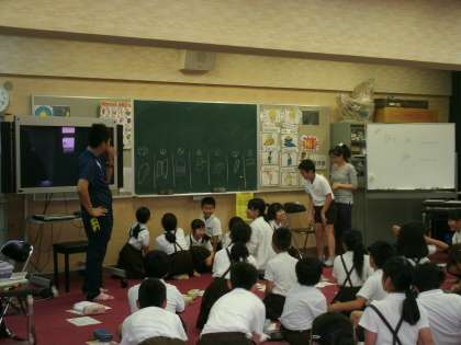 チームに分かれ、1人目が描いた絵は何を表しているのか、英語で答えます。