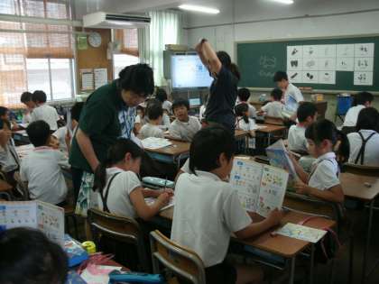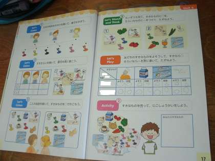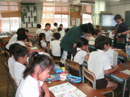 友だちの好きなものを予想して好きなら〇、きらいなら△を書いて英語でたずねあっていました。予想があたると歓声がわいていました。