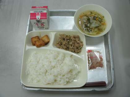今日の給食は、ゴーヤチャンプルー、すまし汁、あつあげのしょうがじょうゆかけ、ごはん、牛乳です。