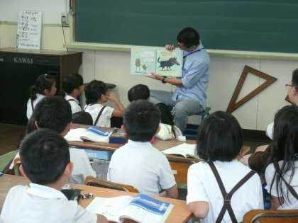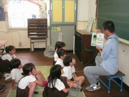 絵本「オレ カエル やめるや」の読み聞かせを聞いていました。
