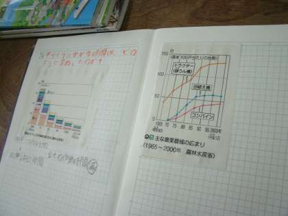 米作りにかかる時間は、どのように変わったのか、資料のグラフを見ながら考えていました。