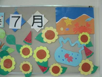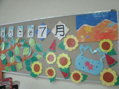 毎週木曜日は、学校図書館補助員さんが終日図書室に在室してくださっています。先週お伝えできませんでしたが、図書室の壁面掲示が7月バージョンにかわっていました。