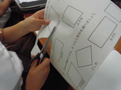 算数で合同な図形について学習しています。2教室を使い、半数ずつの児童で学習しました。今日は、いろいろな四角形を対角線で分けてみるとできる2つの三角形は合同であるか確かめました。このあと合同の条件を探していきます。