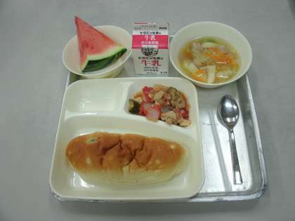 今日の給食は、鶏肉と野菜のソテー、押し麦のスープ、すいか、おさつパン、牛乳です。