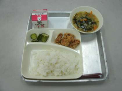 今日の給食は、豚肉の香味あげ、みそ汁、きゅうりの甘酢づけ、ごはん、牛乳です。