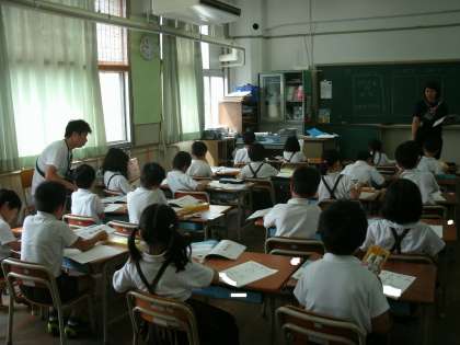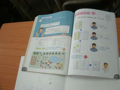 画用紙を半分に折り、絵を描いてお話を考えていました。