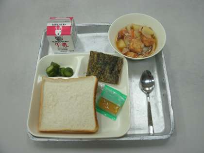 今日の給食は、もずくのヒラヤーチー、豚肉といかの煮物、あっさりきゅうり、食パン、りんごジャム、牛乳です。