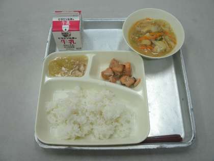 今日の給食は、さけのつけ焼き、みそ汁、とうがんの煮もの、ごはん、牛乳です。