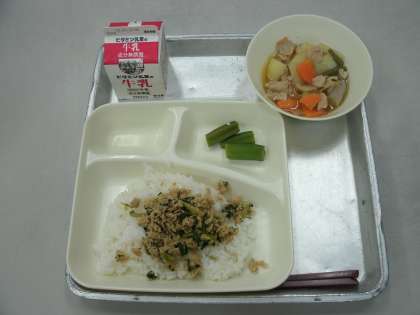 今日の給食は、豚肉とじゃがいもの煮もの、オクラの甘酢あえ、ツナっ葉いため、ごはん、牛乳です。