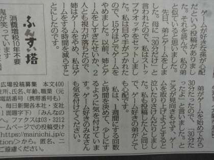 7月26日の毎日新聞に、6年生の児童の投書が掲載されました。題材はゲームについてです。問題点などわかりやすく書かれています。これで、磯路小から4人目の掲載です。ほんとうにすばらしいです。