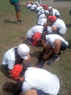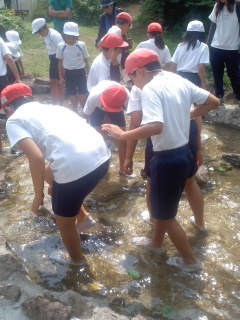 魚つかみと焼き板みがきをしています。吹く風はとてもさわやかです。冷たい水に歓声をあげています。