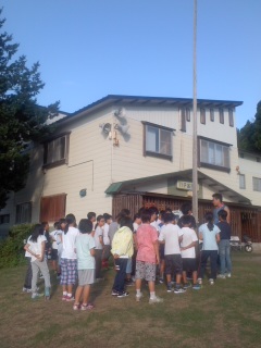 朝の集いの様子です。ラジオ体操の後、今日の予定を確認しました。