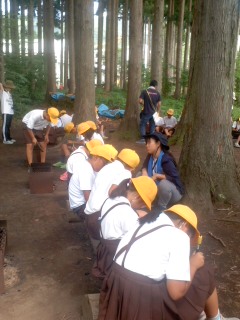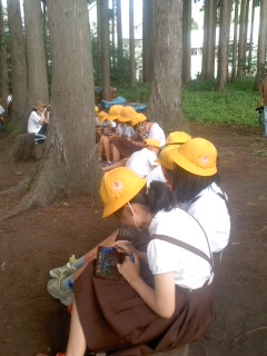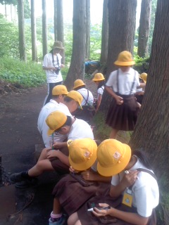 涼しい木陰で初日に磨いた焼き板に絵付けをしています。ハチ高原での思い出を描いています。