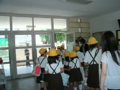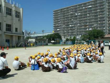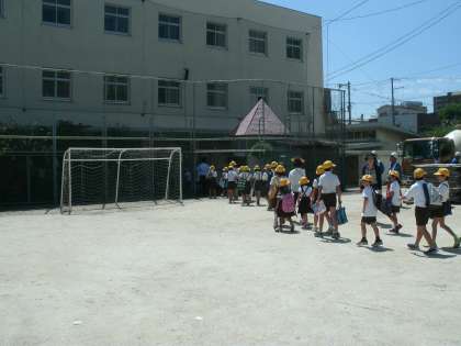 11時10分には運動場に集合し、工事中の場所や資材置き場の近くでは遊ばないことを約束しました。担当教職員の引率で班ごとに集団下校をしました。