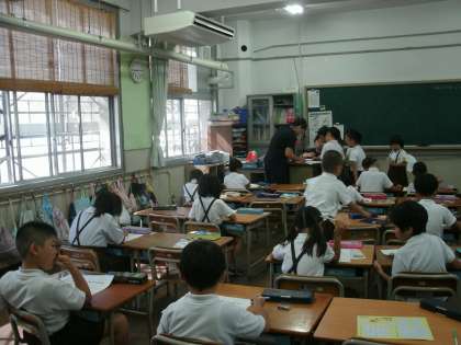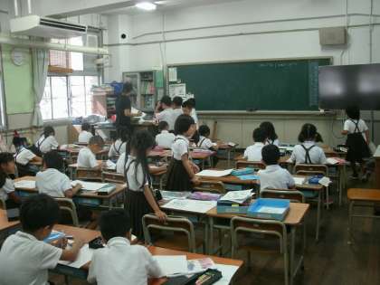 算数プリントの問題が解けたら、担任の先生にチェックしてもらいます。