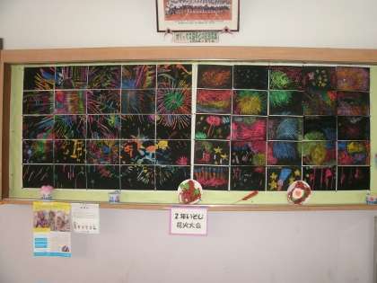 玄関掲示が2年生の作品「2年いそじ花火大会」にかわっています。