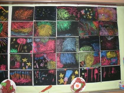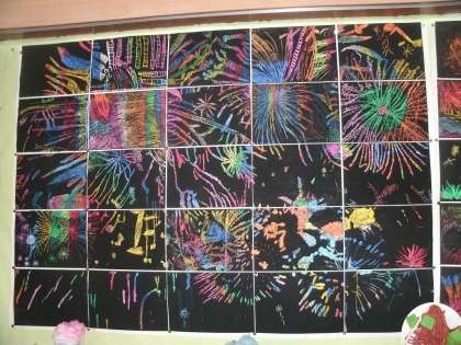 夜空に華やかに広がる打ち上げ花火をみんなで表現しました。