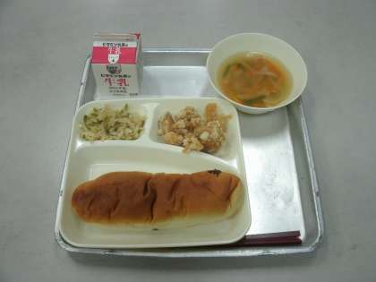 今日の給食は、鶏肉のからあげ、とうがんの中華スープ、切り干しだいこんのごま辛みづけ、レーズンパン、牛乳です。