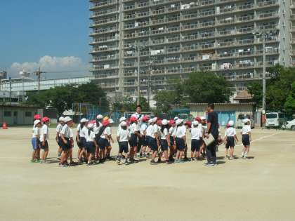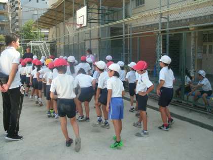 2年生は、運動場で運動会の練習をしていました。