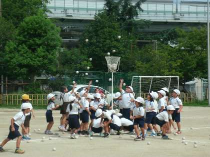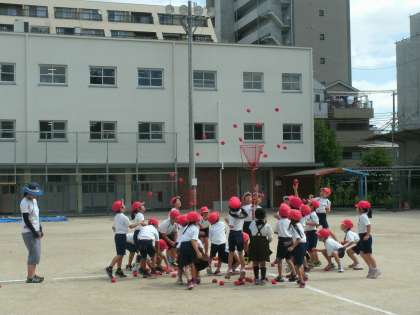 1年生は、運動場で、玉入れの練習をしていました。