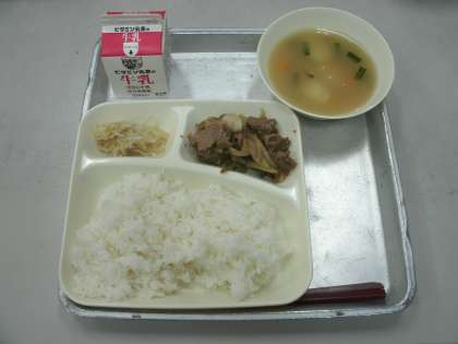 今日の給食は、プルコギ、トック、もやしの甘酢あえ、ごはん、牛乳です。