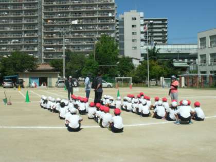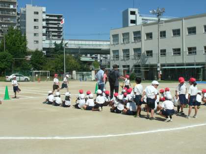 1年生は、運動場で「よーいドン!全力で駆け抜けろ」の練習をしていました。