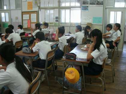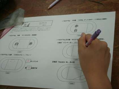 6年1組は、運動会のプログラムに「私は、ここにいます。」と隊列に印をつけたり、リレーの走順を書き込んだりしていました。