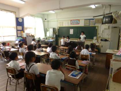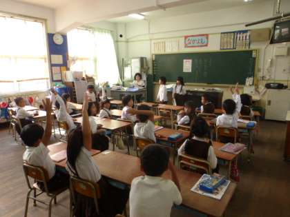 10月15日(水)秋らしいさわやかなお天気になりました。1年生の朝の会の様子です。日直の児童が司会をしています。