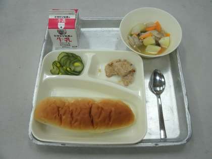 今日の給食は、鶏肉のみそマリネ焼き(ノンエッグドレッシング)、スープ煮、きゅうりとコーンのサラダ、おさつパン、牛乳です。