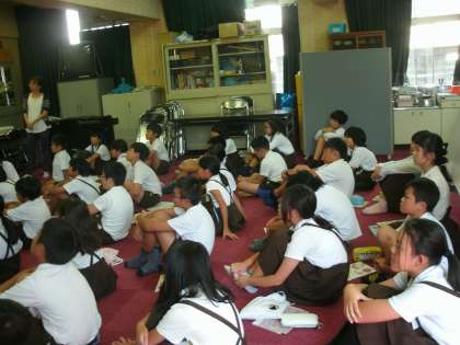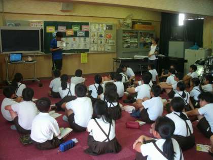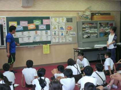 5年生は、多目的室で外国語活動をしていました。1週間の時間割から各教科を英語で言い表していました。
