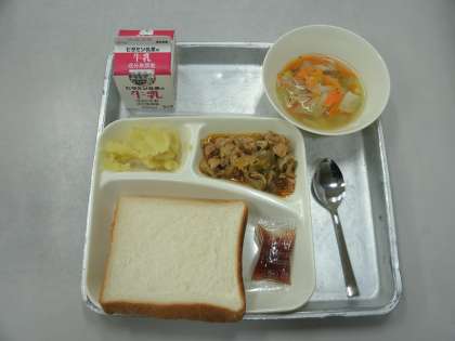 今日の給食は、豚肉と野菜のケチャップソテー、スープ、スイートポテト、食パン、いちごジャム、牛乳です。