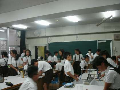 6年2組は、理科室で実験をしていました。