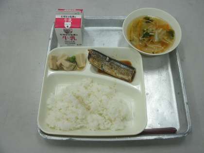 今日の給食は、さんまのさんしょう焼き、すまし汁、高野どうふの煮もの、ごはん、牛乳です。