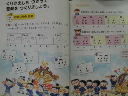 音楽でリズムを作っています。4人組で手拍子をしながら作っていきました。拍の長さや拍の数を工夫していました。