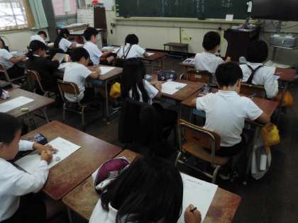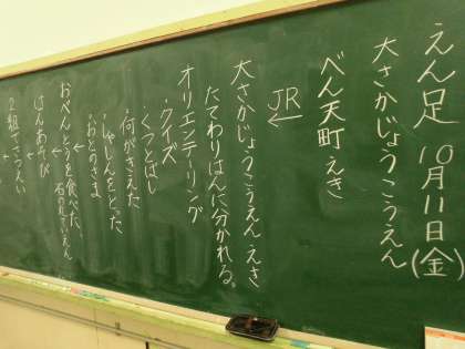 生活科で、全校遠足について振り返りカードに記録する学習を行いました。先生が黒板に書いた日時や行程を見ながら文章を書き、絵も描いて仕上げます。活動の記録の方法をしっかり学ぶことができていました。
