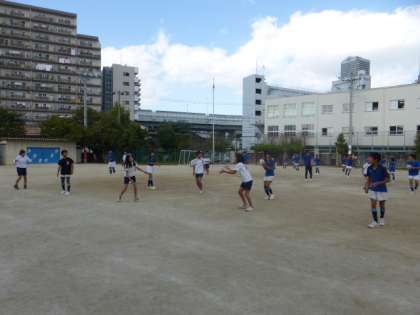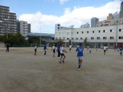 市岡中学校のラグビー部の生徒が、本校の6年生にラグビーを教えてくれました。