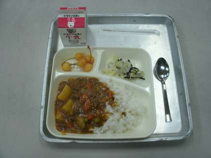 今日の給食は、ハヤシライス(米粉)、キャベツのひじきドレッシング、さくらんぼ(缶)、牛乳です。