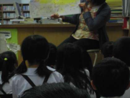 図書に時間に、図書館補助員の先生に読み聞かせをしてもらいました。熱心に聞くことができました。