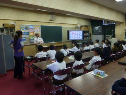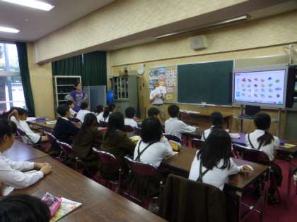 5年生は、ニールマーフィー先生と外国語活動の学習をしていました。絵カードを見て、発音の練習をしているところです。