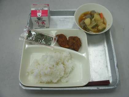 今日の給食は、みそカツ、じゃがいもと野菜の煮物、焼きのり、ごはん、牛乳です。