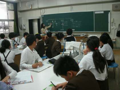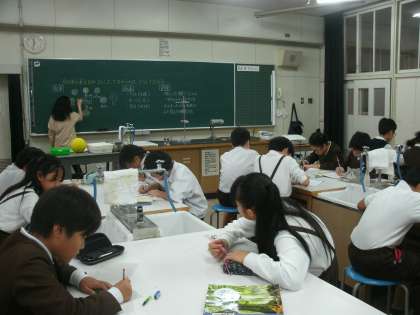 月の見え方が日によってちがうのはどうしてか、理科室を暗室にして月に見立てたボールに照明をあてて考えていました。