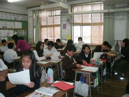 担任の先生と外国語活動専科教員との会話を参考にした後、となり同士や席を移動して会話を楽しんでいました。
