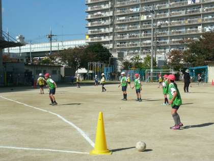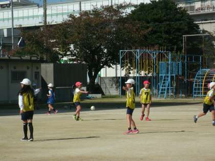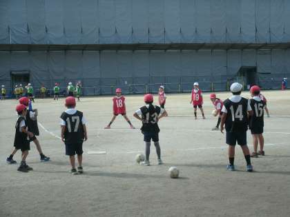 キックベースボールのチーム練習を、試合の前にしているところです。