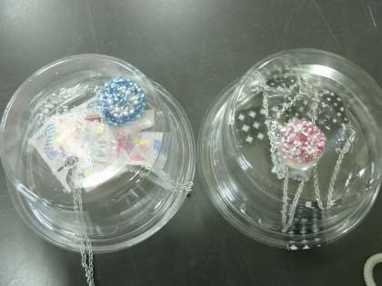 きれいにデコレーションされたペンダントトップの裏側には小さなアロマポットがついていました。できあがった作品を見せていただきました。