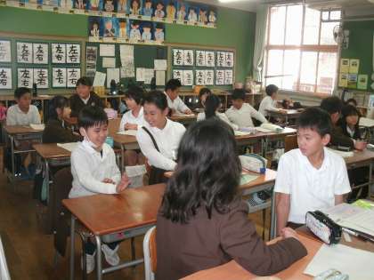 4年2組は、学習発表会の練習風景の映像を見た後、改善するところやもっと工夫すると良いところなどを自分たちで見つけて話し合っていました。